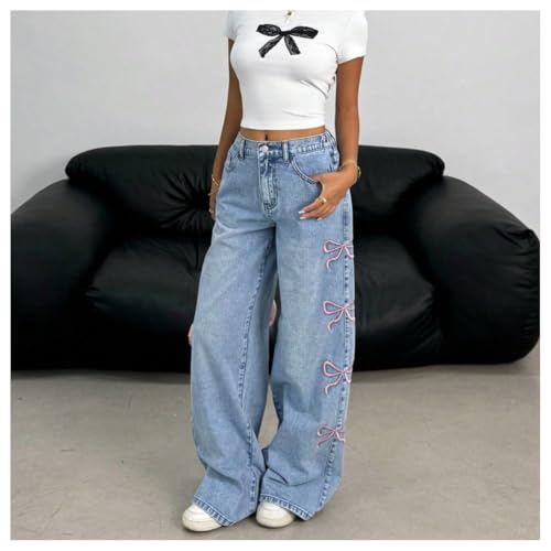 • Features: Y2k baggy jeans for girls, bowknot embroidered, mid waisted, straight leg, loose fit
