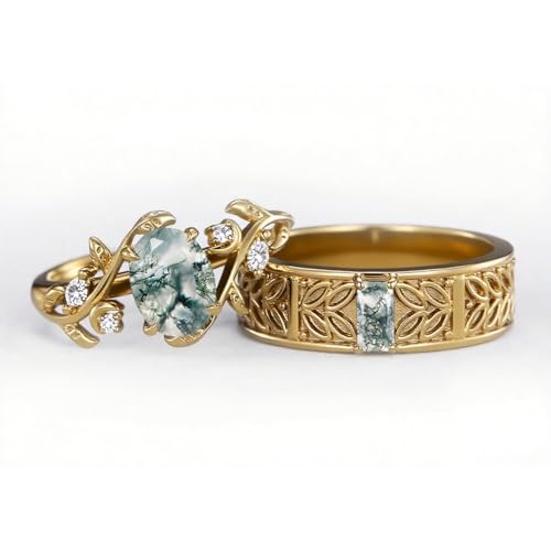 • 【Couple Oval Moss Agate Rings Set 】:Natural moss agate symbolizes vitality and love.It represents that love is entwined for a lifetime like water plants in the river, and will never leave,until death.Crafted as a matching set for two.The intricate vine-and-leaf detailing adds romantic,nature-inspired charm—perfect for engagements,weddings,or anniversary promises.
