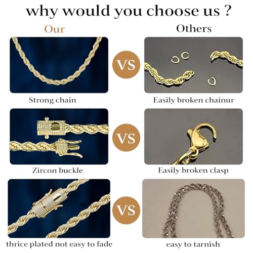 • 【Durable and comfortable】This gold rope chain is well-made, and the tight twist pattern enhances durability. Each link is perfectly polished for a silky skin touch. The sturdy structure is durable and is a long-lasting investment choice that you deserve to wear again and again.