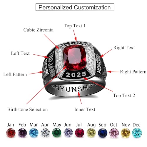 • 【Customization】: We offer a fully customization service for high school rings where you can choose the material (925 sterling silver/10K/14K/18K Gold), main stone, pattern and text according to the characteristics of the class and your own preferences, with a variety of sizes(5-15) to choose from, making the graduation Ring even more personalized