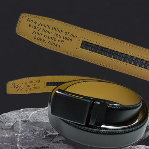 • PERSONALIZED GIFTS FOR MEN: The inside tip of the belt can be engraved with a custom gift message. Your choice of Arial font for a bold clear message, or Apple Chancery font for a fun and stylish message. Add a simple photo, logo, or emoji for an extra personalized touch as a gift for new dads, 1st anniversary gift, or funny boyfriend gift.