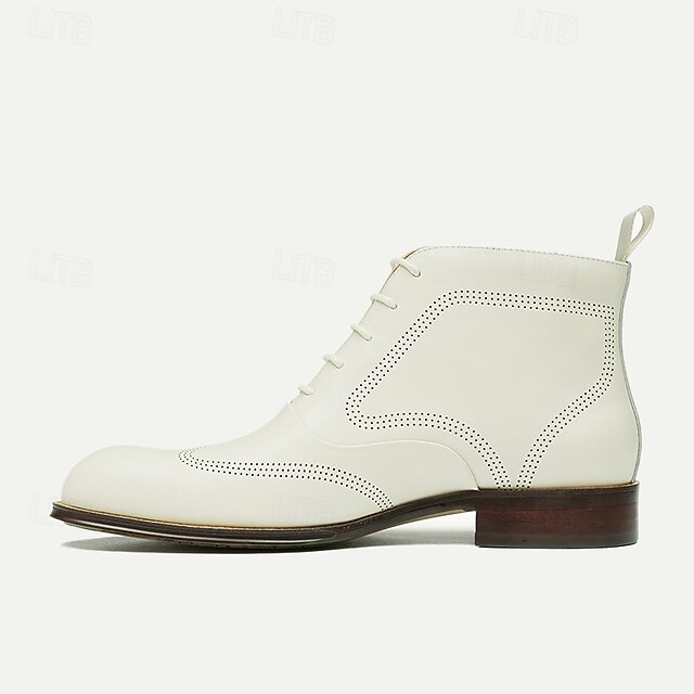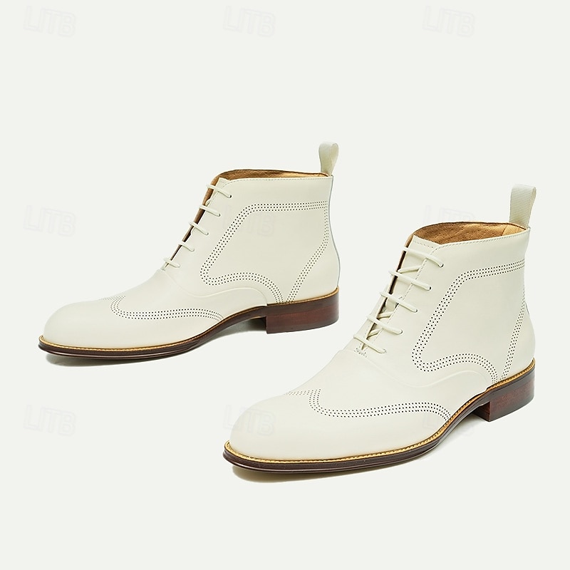 Highlights [Fabric] Crafted from 100% premium Italian full-grain cowhide leather, these men's boots offer a luxurious look and feel, ensuring both durability and elegance. The high-quality leather provides a refined finish that's perfect for sophisticated footwear. [Fit] Designed with a classic lace-up closure, these boots offer a secure and adjustable fit, accommodating a variety of foot shapes. The round toe shape provides comfort without compromising style, making them suitable for long hours of wear. [Design Highlights] Featuring tasteful perforated detailing, these boots add a sophisticated touch to any ensemble. The polished wooden sole not only contributes to their stylish appearance but also offers excellent support and comfort for everyday use. The neutral white color ensures versatility, adapting effortlessly to different outfits and occasions. [Occasions] Ideal for business formal settings, these versatile boots are perfect for enhancing your look at corporate meetings, formal events, or smart-casual gatherings. Whether paired with a tailored suit or dressed down with smart-casual attire, these boots elevate any outfit with their refined design. [Size Range] Available in a wide range of sizes, from US5 / EU38 / UK4 to US13 / EU46 / UK12, these boots cater to a broad audience, ensuring a perfect fit for every customer.