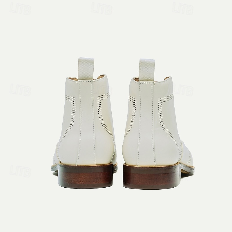 Men's Premium Cowhide White Oxford Boots – Perforated Design, Business Formal Leather Ankle Boots 8