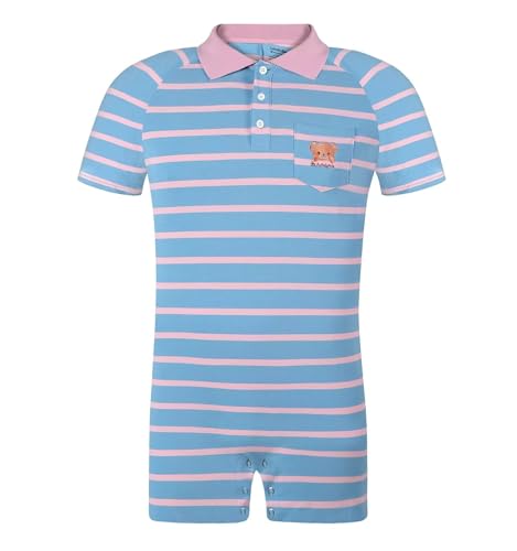 • Men's polo shirt bodysuit featuring turn-down for a more upscale look. There is a small chest pocket with a cute bear embroidered on it. The classic stripe design is also stylish.