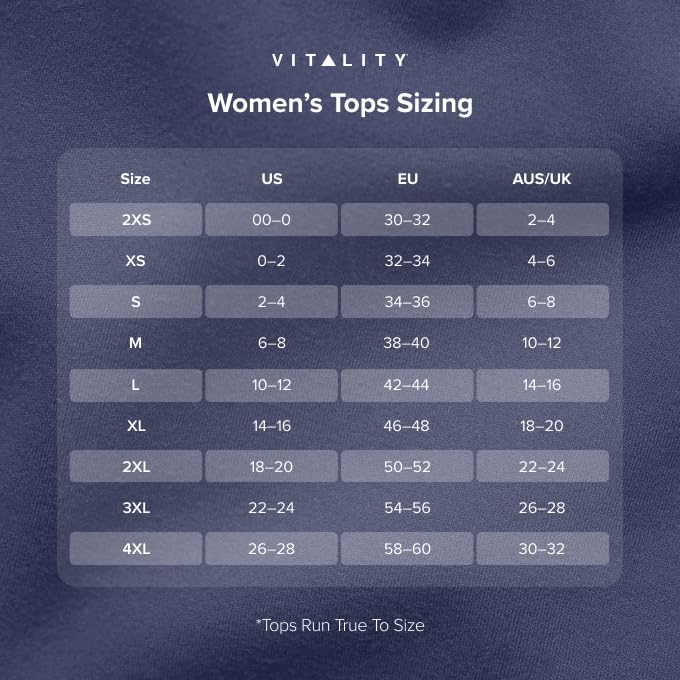 • INCLUSIVE SIZE RANGE: At Vitality, we believe that great athleisure should be accessible to everyone. Our workout tops for women are available in sizes XXS–4XL, ensuring a perfect fit for all body types. Experience the comfort and confidence of well-designed activewear tailored just for you.