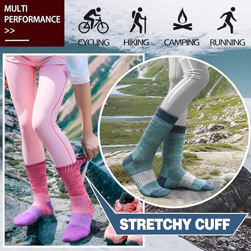 • Protection for Feet:These womens wool hiking crew socks have stretchy cuff and arch support ,which can improve the blood circulation and keep socks fit snugly.Cushion foot absorbs shock and reduces risk of blister.All of these provide more protection for women’s feet.