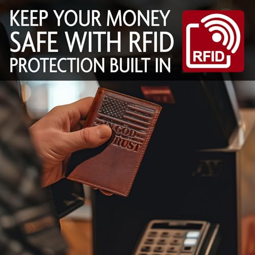 HOT ! The Patriot American Flag Trifold Wallet for Men, RFID Blocking, Double Bill Compartment, Full Grain Cowhide Leather Wallet, Vintage Brown