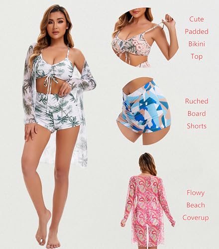 Yknktstc Womens 3 Pieces Bikini Set Swimsuit Tropical Beach Cover up Kimono Swimwear Bathing Suit with Boy Shorts 4