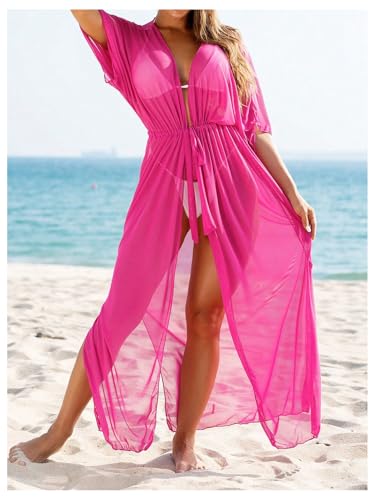 • Features: Short sleeve, tie waist, mesh sheer, solid color, flowy long kimono, sheer beach cover ups