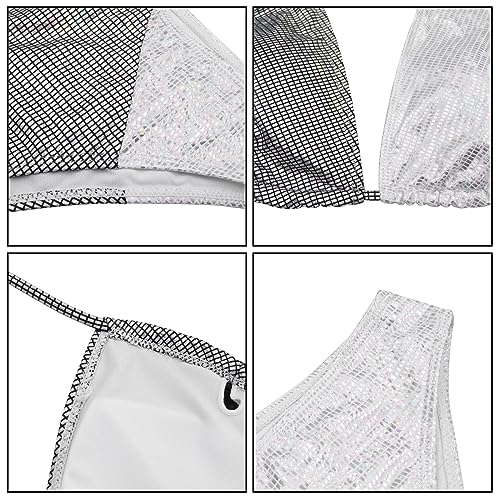 • FEATURES: These sexy bikini set features 2 piece, sparkle silver and white metallic fabric, halterneck, backless, high waist, thong bottoms, cross wrap design and tie it at the back. Stretchy swimsuit ensures best fit and comfortable wearing.