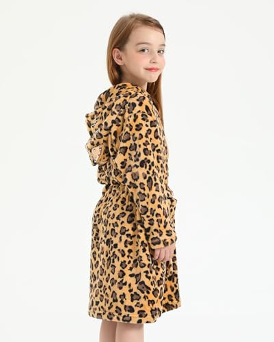 ACTLATI Leopard Cat Fleece Hooded Robe for Girls, Plush Bathrobe With Pockets for 3-12 Years Kids Birthday Christmas Gifts 6