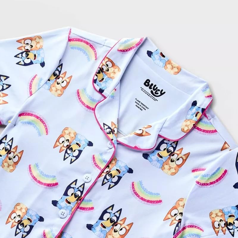 • 🌈 2-Piece Bluey & Bingo Pajama Set – Includes button-down top with collar and matching shorts for a classic bedtime look.
