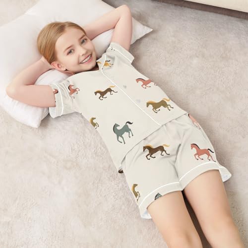 Satin Pajama Sets Short Sleeve Cute Horses Seamless Pattern Button Down Silky Nightwear 2 Piece PJS 5-14Y 6