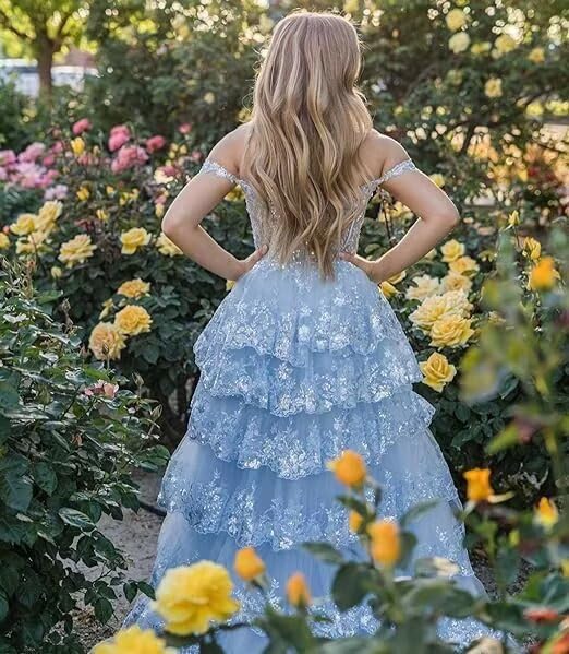 Women's Sequin Prom Dresses 2025 Tulle Lace Appliques Off Shoulder Formal Evening Dress with Slit 7