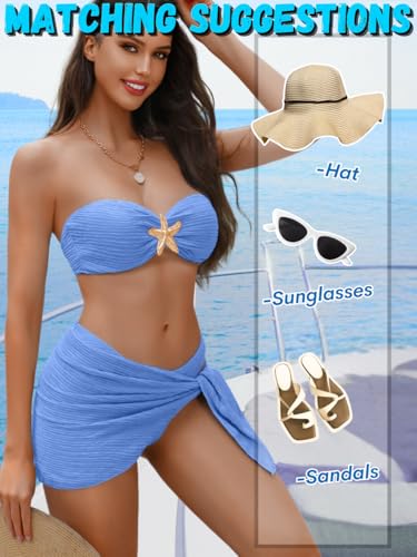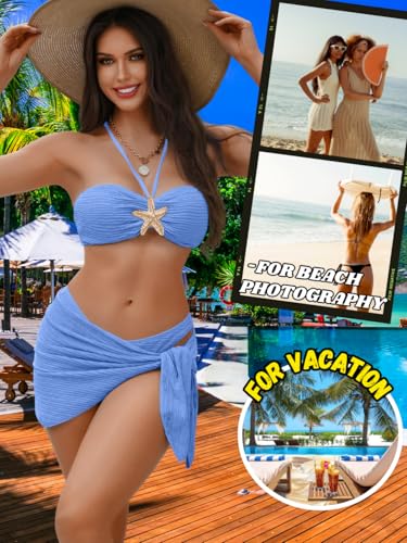 Sexy Womens Starfish 3 Piece Bikini Set, Textured Halter Bandeau Swimsuit Cover Up Skirt, Bathing Suit Beach Outfits 5