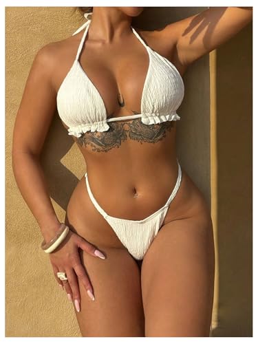 HOT ! SOLY HUX Women's 3 Piece Bikini Sets Frill Trim Halter Swimsuit Backless Textured Bathing Suit with Shorts