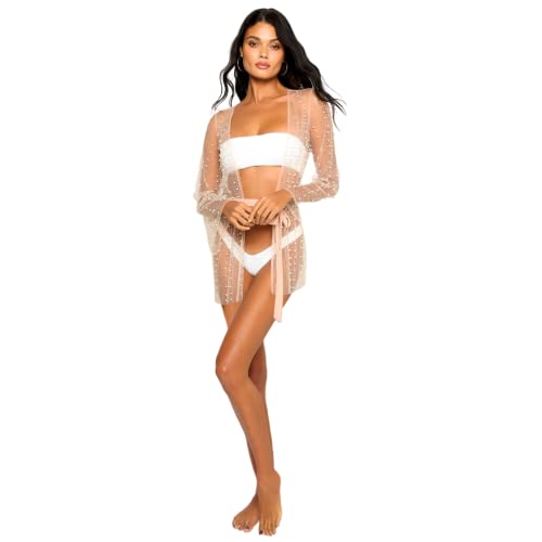 More information about Women's Sexy Pearl Rhinestone Sheer Mesh Beach Cover Up Long Sleeve Kimono Cardigan Tie Front Blouse