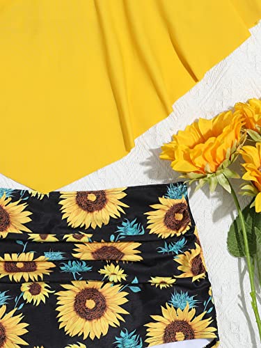 WDIRARA Women's 2 Piece Set Sunflower Print Tankini Scoop Neck High Waist Bikini Swimsuit 3