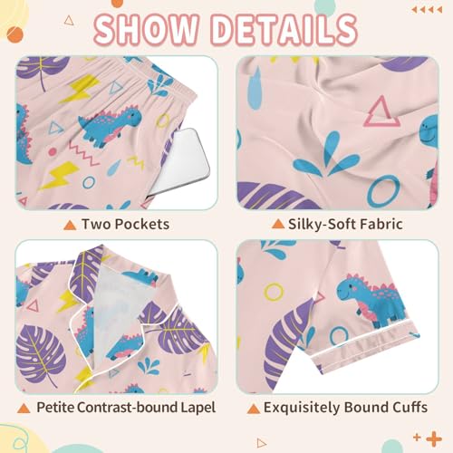 Satin Pajama Sets Short Sleeve Dinosaur Leaves Triangle Button Down Silky Nightwear 2 Piece PJS 5-14Y 4