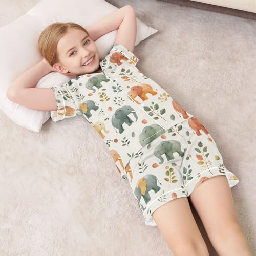 ALAZA Elephant Leaves Watercolor Satin Pajamas Set Short Sleeve Button Down Sleepwear Summer Pjs 2 Piece 1