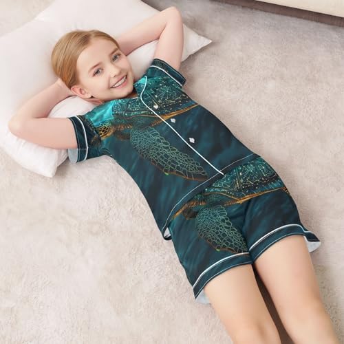 ALAZA Green Sea Turtle Golden Satin Pajamas Set Short Sleeve Button Down Sleepwear Summer Pjs 2 Piece 1