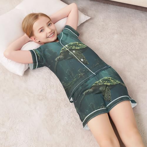 ALAZA Green Turtle Cityscape Satin Pajamas Set Short Sleeve Button Down Sleepwear Summer Pjs 2 Piece 1