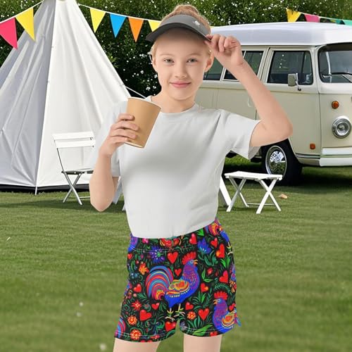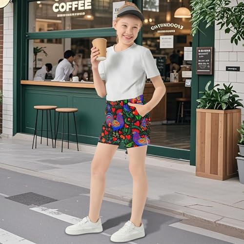Folk Art Colorful Roosters Girls Lounge Athletic Shorts Custom Print Youth Summer Pajama Sleepwear, X-Small 6