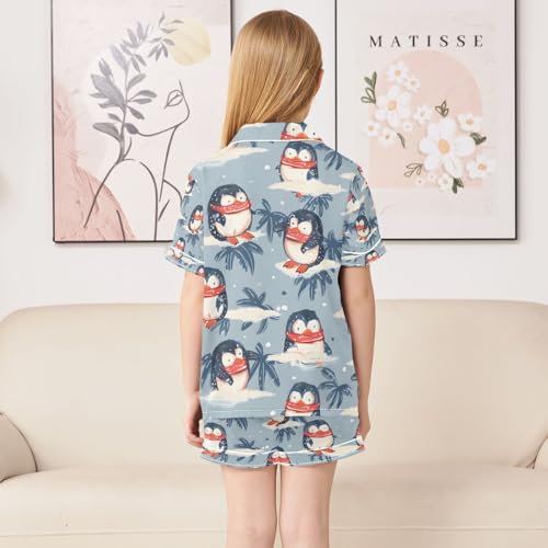 Penguin with Scarf Satin Summer Pajama Sets Silk Short Sleeve Button Down Sleepwear 4