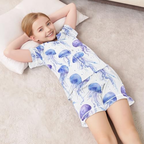 HOT ! Watercolor Charming Jellyfish Pattern Summer Satin Pajama Set, Cute Button-Down Sleepwear Pj Set for Sleep Wears
