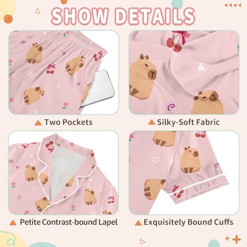 Cute Capybara with Cherry Prints Summer Satin Pajama Set, Cute Button-Down Sleepwear Pj Set for Sleep Wears 4