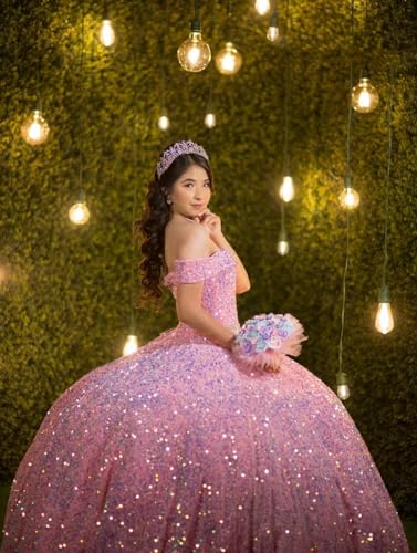 Mauuwy Sparkly Off Shoulder Sequin Quinceanera Dresses with Train Puffy Prom Dresses Long Ball Gown for Women Sweet 16 Dress 5