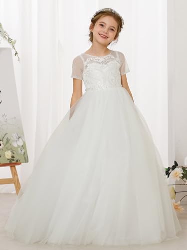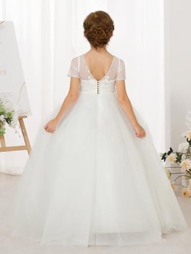 More information about MCieloLuna 2025 Girls Princess Dresses Lace Tulle Flower Girl First Communion Dress Short Sleeve Wedding Pageant Gown