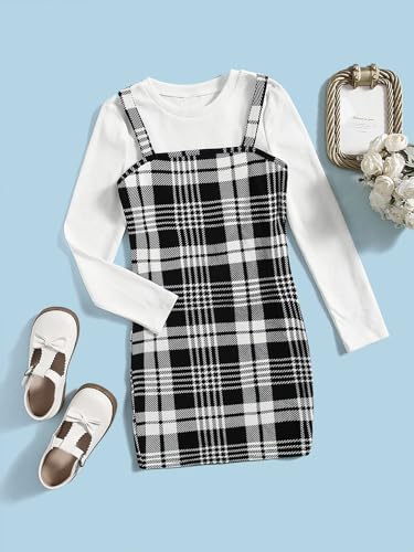 • Feature: 2 Piece, Long Sleeve Tee Shirt, Plaid Dress, Short Dress, Crewneck and Strap Dress