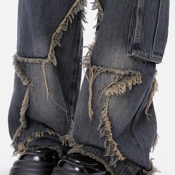 • STYLE FEATURES: High-waisted cargo jeans with dramatic distressed patches and frayed edges, featuring a unique wide-leg silhouette for a bold Y2K aesthetic