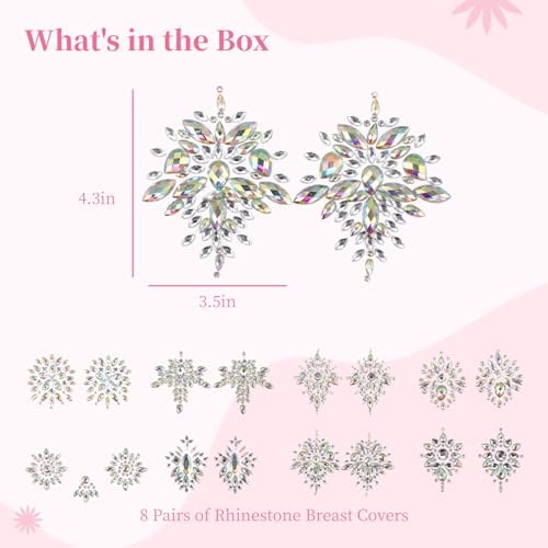 More information about 8 Pairs Rhinestone Breast Covers, Resin Rhinestone Pasties, Glitter Crystal Tattoo Jewels, Adhesive Breast Gem, Temporary Chest Sticker, Body Jewelry Sticker, Decoration Pasties for Parties