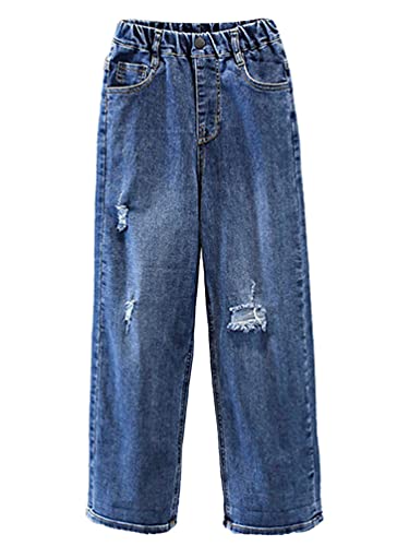 Kids Girls Elastic Waist Ripped Jeans Distressed Denim Pants Washed Wide Leg Straight Baggy Trousers 5