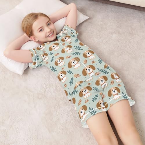 Cartoon Beagles Print Summer Satin Pajama Set, Cute Button-Down Sleepwear Pj Set for Sleep Wears 6