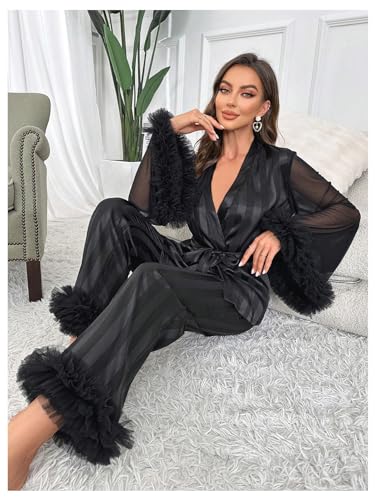 Verdusa Women's 2 Piece Tulle Trim Satin Pajama Set Ruffled Mesh Long Sleeve Belted Top and Pants 2