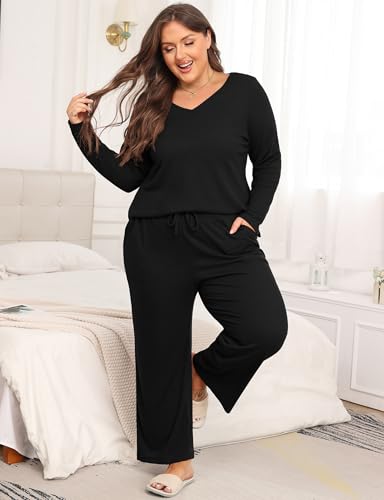 HOT ! Women's Plus Size 2 Piece Pajama Lounge Sets Knit Outfits Long Sleeve V Neck Tops Wide Leg Pants with Pockets