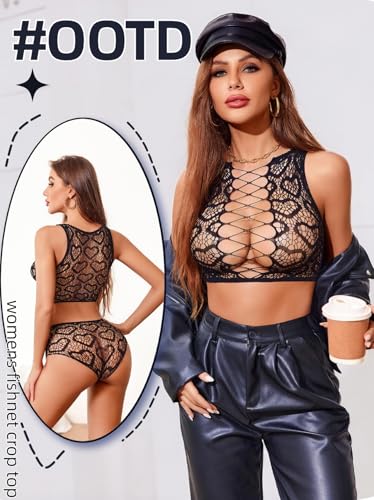 More information about Avidlove Womens Fishnet Lingerie Set Sexy Two Piece Lingeries Hollow Out Stripper Outfit Heart Print Mesh Crop Tops