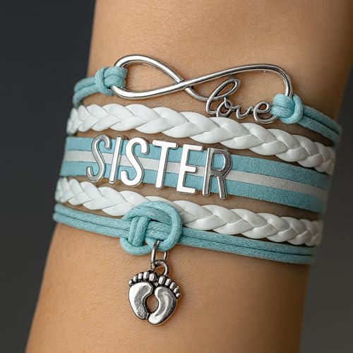 • MEANINGFUL DESIGN – Features braided blue and white bands with silver-tone infinity “Love” charm and bold “Sister” letters, symbolizing a lasting bond.