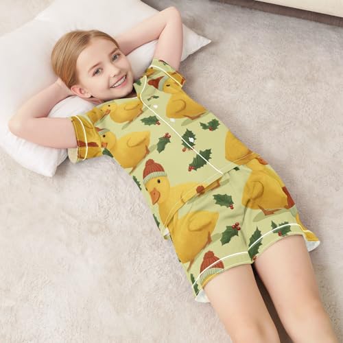 Satin Pajama Sets Short Sleeve Christmas Ducks with Holly Leaves Button Down Silky Nightwear 2 Piece PJS 5-14Y 7
