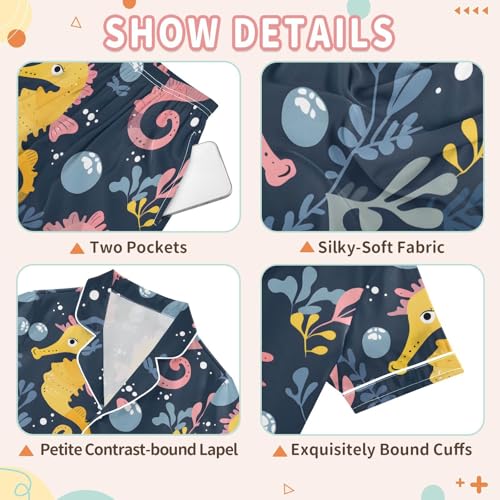 ALAZA Seahorse Leaves Navy Blue Satin Pajamas Set Short Sleeve Button Down Sleepwear Summer Pjs 2 Piece 2