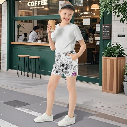 Girls Athletic Shorts Cute White Skulls Flowers Leaves Pink Printed Pajama Summer Kids Activewear Customized, X-Small 5