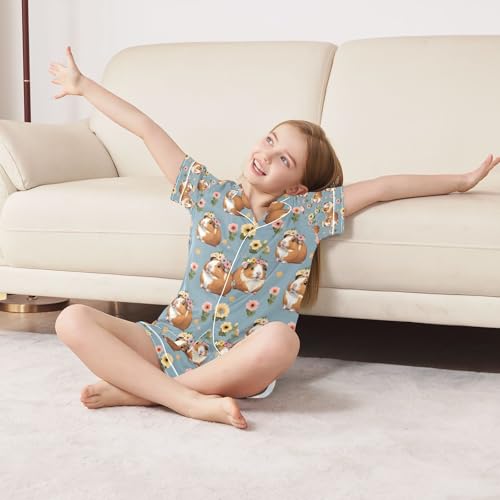 HOT ! senya Cute Capybara Flower Satin Summer Pajama Sets Silk Short Sleeve Button Down Sleepwear
