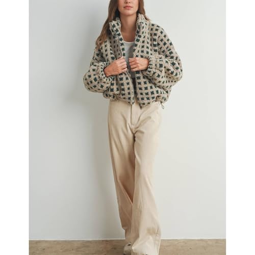• Feature: Womens cropped checkered sherpa jacket,long sleeve, zip up closure, ginham plaid design, drop shoulder, lapel collar, 2 welt pocket, elastic drawstring hem design, this jacket is designed to elevate your wardrobe while cocooning you in luxurious softness.