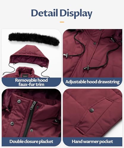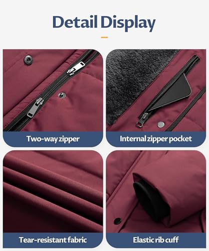 • Practical Design: Excellent double zippers. It provides more room for your legs while keeping you warm. There are 2 deep pockets and 1 internal pocket. The deep pockets offer ample space for safely storing daily essentials like gloves and wallets, and the internal security pocket provides a hidden, secure spot for valuables such as keys or cards. The waist drawstring of the ladies padded jacket allows you to adjust the fit. The detachable hood with faux fur trim is cute and stylish.