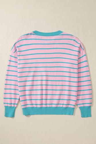 HOT ! Women's Pink Stripe Trimmed Round Neck Drop Shoulder Sweater