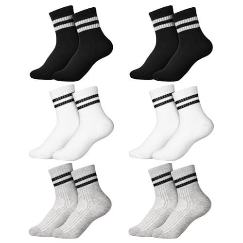 • Girls Boys Cotton Socks Set: This set includes 6 pairs of children's crew cotton socks in classic black, white, and gray colors, with 2 pairs of each. The stripped design easily complements various children's outfits, suitable for both boys and girls