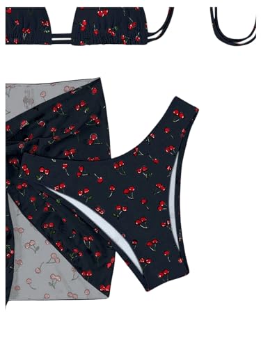 • Feature: Cherry print, halter neck, triangle bikini top, bikini button, coverup skirt, 3 piece bathing suit
